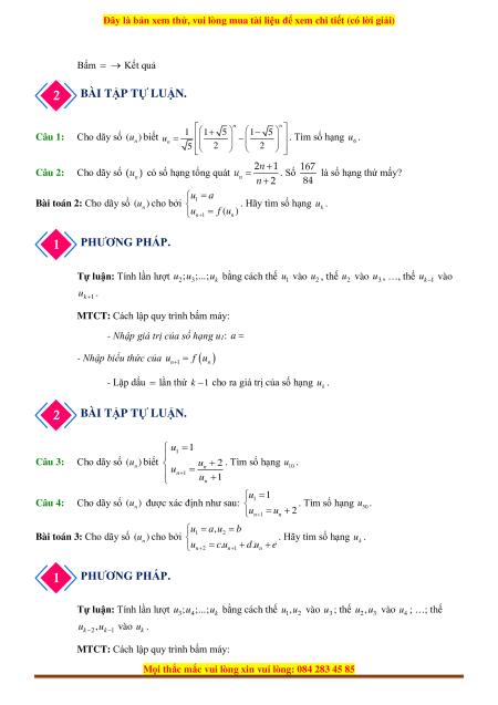 Tự luận: Tính lần lượt u ;u ;...;u bằng cách thế u ,u vào u ; thế u ,u vào u ; …; thế 3 4 k 1 2 3 2 3 4 u , u u . k −2 k 1 − vào k