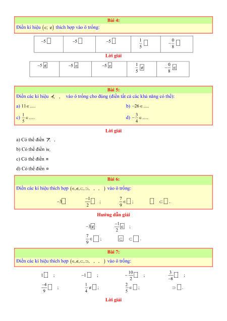 Vì các số nguyên đề có thể viết được dưới dạng phân số với mẫu số là 1 nên các số nguyên đều là số hữu tỉ. Bài 3: Điền kí hiệu ;