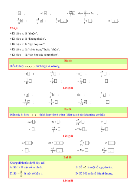 Vì các số nguyên đề có thể viết được dưới dạng phân số với mẫu số là 1 nên các số nguyên đều là số hữu tỉ. Bài 3: Điền kí hiệu ;