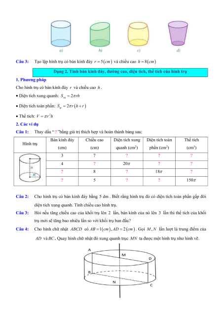 Dạng 2. Tính bán kính đáy, đường cao, diện tích, thể tích của hình trụ 1. Phương pháp