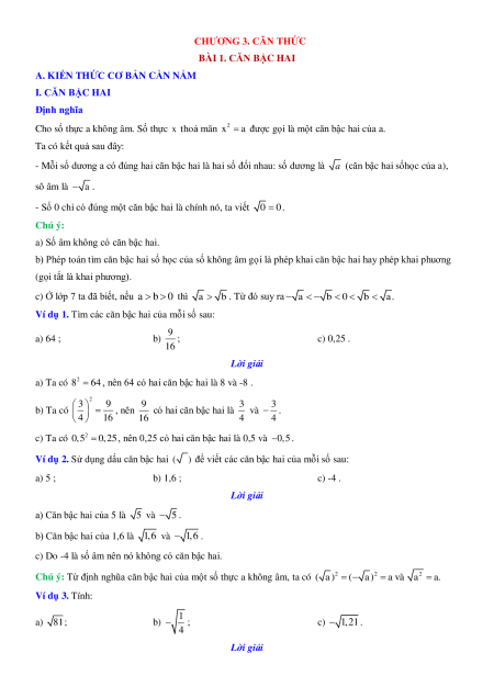 CHƯƠNG 3. CĂN THỨC BÀI 1. CĂN BẬC HAI