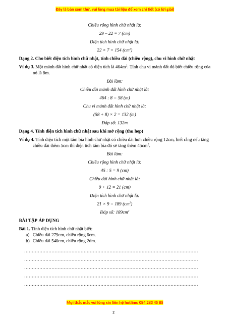 Dạng 2. Cho biết diện tích hình chữ nhật, tính chiều dài (chiều rộng), chu vi hình chữ nhật