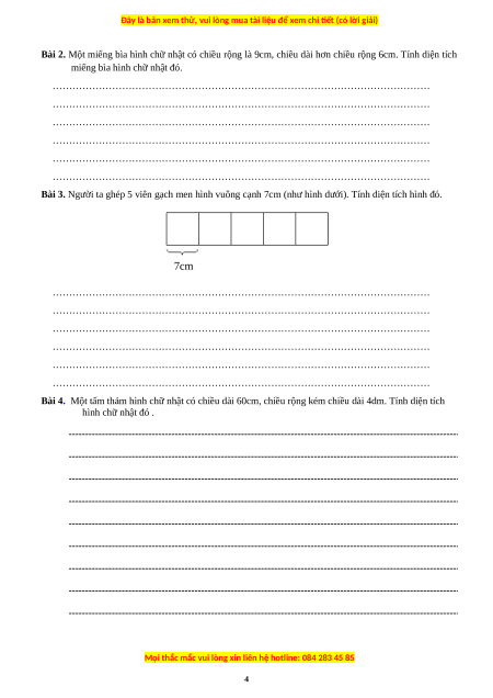 Bài 4. Một tấm thảm hình chữ nhật có chiều dài 60cm, chiều rộng kém chiều dài 4dm. Tính diện tích