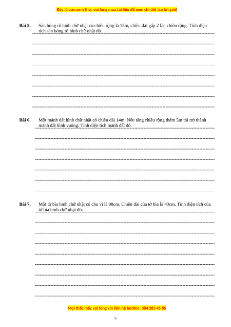 Bài 5. Sân bóng rổ hình chữ nhật có chiều rộng là 15m, chiều dài gấp 2 lần chiều rộng. Tính diện