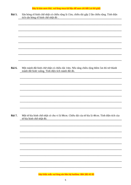 Bài 5. Sân bóng rổ hình chữ nhật có chiều rộng là 15m, chiều dài gấp 2 lần chiều rộng. Tính diện