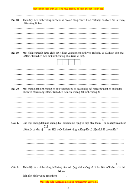 Bài 18. Tính diện tích hình vuông, biết chu vi của nó bằng chu vi hình chữ nhật có chiều dài là 10cm,