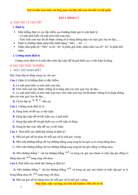 Đây là bản xem th , vu ử i lòng mua tài li u ệ đ xe ể m chi ti t ế (có l i ờ gi i ả ) BÀI 4. Đ N Ị H LÝ A. TÓM T T Ắ LÝ THUY T Ế 1. Đ n ị h lý M t ộ khẳng đ nh c ị