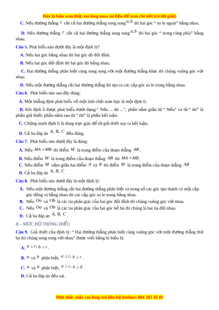 Câu 8. Phát bi u nà ể o dư i ớ đây là một đ nh ị lý: A. Nếu một đư ng ờ thẳng cắt hai đư ng ờ th ng phâ ẳ n bi t ệ và trong s c ố ác góc t o t ạ hành có m t ộ c p ặ góc đ ng v ồ