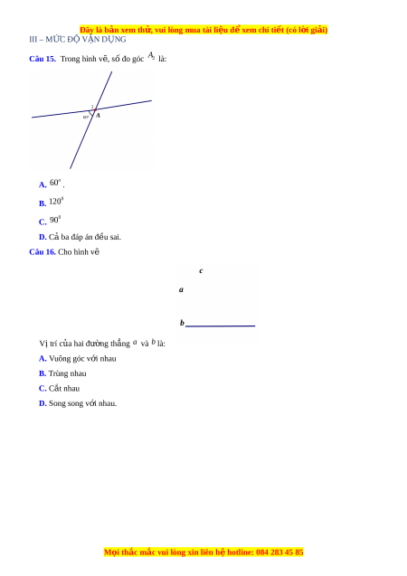 Câu 15. Trong hình v , s ẽ đo góc ố A2 là: A. 60o . 0 B. 120 0 C. 90