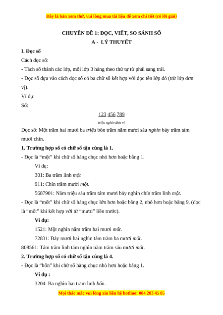 CHUYÊN ĐỀ 1: ĐỌC, VIẾT, SO SÁNH SỐ A - LÝ THUYẾT I. Đọc số Cách đọc số: