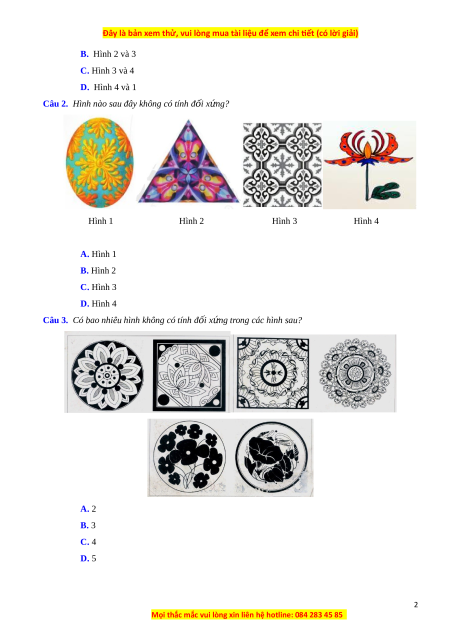 Câu 2. Hình nào sau đây không có tính đ i ố x ng? ứ Hình 1 Hình 2 Hình 3 Hình 4 A. Hình 1 B. Hình 2 C. Hình 3 D. Hình 4
