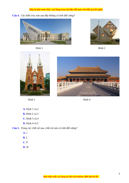 Câu 4. Các kiến trúc nào sau đây không có tính đ i ố x ng? ứ Hình 1 Hình 2 Hình 3 Hình 4 A. Hình 1 và 2 B. Hình 2 và 3 C. Hình 3 và 4 D. Hình 4 và 5