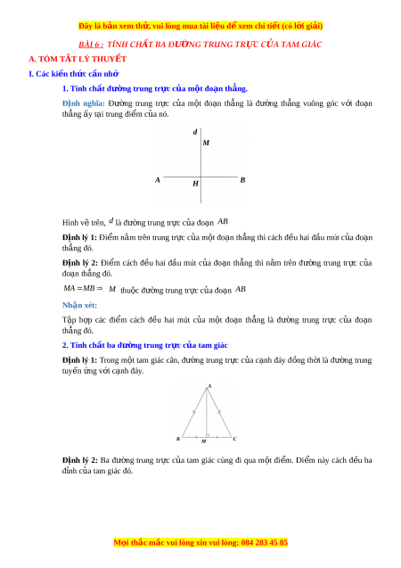 BÀI 6 : TÍNH CH T Ấ BA ĐƯ N Ờ G TRUNG TR C Ự C A Ủ TAM GIÁC A. TÓM T T Ắ LÝ THUY T Ế I. Các ki n ế th c ứ c n ầ nhớ 1. Tính ch t đ ấ ư n ờ g trung tr c ự c a ủ m t đ ộ o n ạ th n ẳ g. Định nghĩa: Đư ng ờ trung tr c ự c a ủ m t ộ đo n ạ th ng ẳ là đư ng ờ th ng ẳ vuông góc v i ớ đo n ạ thẳng y t ấ ại trung đi m ể của nó. Hình v t