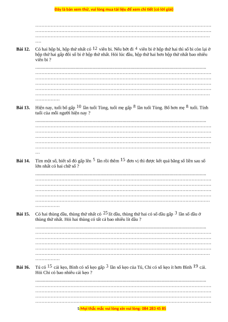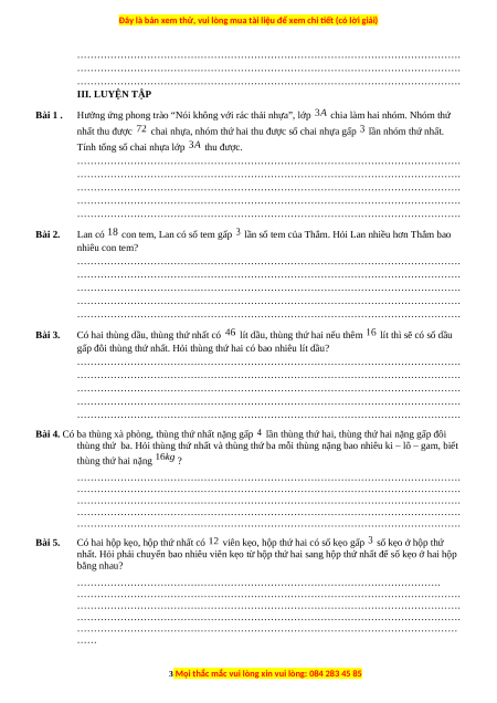 Bài 4. Có ba thùng xà phòng, thùng thứ nhất nặng gấp lần thùng thứ hai, thùng thứ hai nặng gấp đôi