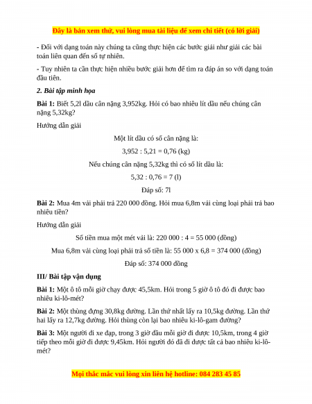 Bài 1: Biết 5,2l dầu cân nặng 3,952kg. Hỏi có bao nhiêu lít dầu nếu chúng cân nặng 5,32kg? Hướng dẫn giải