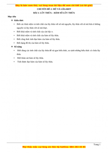 BÀI 1: LŨY THỪA – HÀM SỐ LŨY THỪA Mục tiêu Kiến thức
