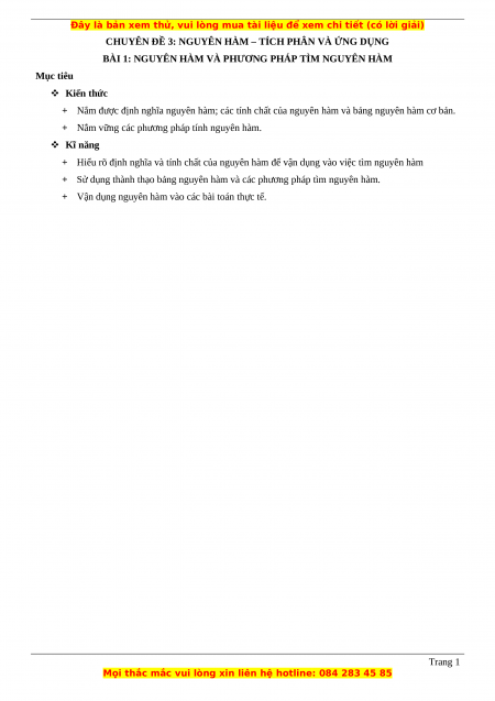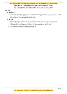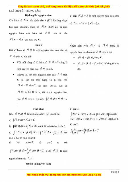 + Nắm được định nghĩa nguyên hàm; các tính chất của nguyên hàm và bảng nguyên hàm cơ bản.