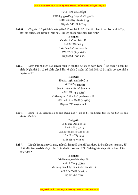 1233 kg gạo đóng được số túi gạo là: ( túi) dư 3 kg Đáp số: 246 túi dư 3kg Bài 61.