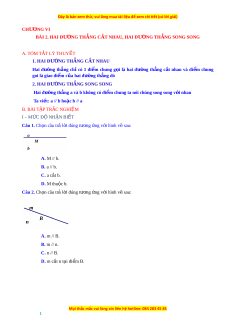 CHƯƠNG VI BÀI 2. HAI ĐƯ N Ờ G TH N Ẳ G C T Ắ NHAU, HAI ĐƯ N Ờ G TH N Ẳ G SONG SONG A. TÓM T T Ắ LÝ THUY T Ế 1. HAI ĐƯ N Ờ G TH N Ẳ G C T Ắ NHAU Hai đư n ờ g th n ẳ g chỉ có 1 đi m ể chung g i ọ là hai đư n ờ g th n ẳ g c t ắ nhau và đi m ể chung goi là giao đi m ể c a h ủ ai đư n ờ g th n ẳ g đó 2. HAI ĐƯ N Ờ G TH N Ẳ G SONG SONG Hai đư n ờ g th n