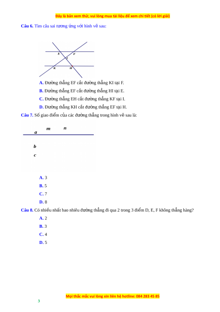 Câu 6. Tìm câu sai tư ng ơ ng v ứ i ớ hình v s ẽ au: A. Đư ng t ờ hẳng EF cắt đư ng ờ thẳng KI tại F. B. Đư ng t ờ hẳng EF cắt đư ng t ờ hẳng HI t i ạ E. C. Đư ng t ờ hẳng EH cắt đư ng ờ thẳng KF t i ạ I. D. Đư ng t ờ hẳng KH cắt đư ng ờ thẳng EF t i ạ H. Câu 7. S gi ố ao điểm c a ủ các đư ng t ờ hẳng trong hình v s ẽ au là: A. 3 B. 5 C. 7 D. 8