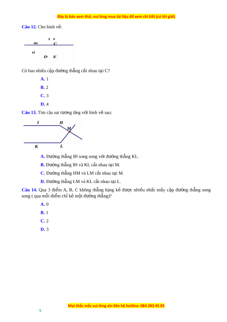 Câu 14. Qua 3 đi m A, B, C không th ng hàng k đ c nhi u nh t m y c p đ ng th ng songể ẳ ẻ ượ ề ấ ấ ặ ườ ẳ
