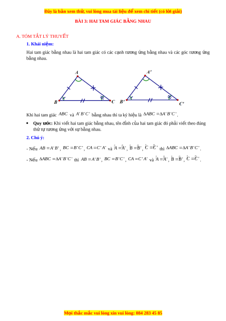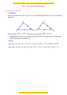 BÀI 3: HAI TAM GIÁC B N Ằ G NHAU A. TÓM T T Ắ LÝ THUY T Ế 1. Khái ni m: ệ Hai tam giác b ng