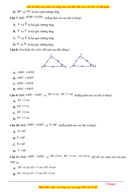 D. R và H là hai góc tư ng ơ ng. ứ Câu 8: Cho hình v , ẽ cách vi t ế nào sau đây đúng ? A. A BC F EK B. A BC K EF C. B AC F EK D. B AC K EF Câu 9: Bi t ế ABC D EF và AB 5 cm , BC 7 cm . Khẳng đ nh nà ị o sau đây là đúng? A. EF 5 cm B. DE 7 cm C. DF 5 cm D. EF 7 cm Câu 10: Bi t ế A BC D EF và o A 48 . Khẳng đ nh nà ị o sau đây là đúng? A. o B 48 B. o E 48 C. o D 4 8 D. o F 4 8 Câu 11: Bi t ế A BC D EF và AB 5 cm , BC 7 cm , CA 6 cm . Độ dài các c nh ạ c a ủ tam giác DEF là: A. DE 5 cm, EF 7 cm, FD 6 cm B. DE 6 cm, EF 7 cm, FD 5 cm Trang 3 M i