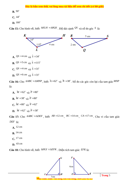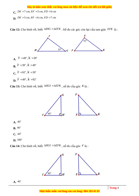 ủ tam giác EFK là : o o A. F 49 , K 39 o o B. F 39 , K 49 o o C. F 92 , K 39 o o D. F 49 , K 92 Câu 13: Cho hình v , ẽ bi t ế H GI EF K , số đo c a ủ góc K là : A. o 46 B. o 90 C. o 44 D. o 180 Câu 14: Cho hình v , ẽ bi t ế H GI EF K , số đo c a ủ góc F là : A. o 46 Trang 4 M i