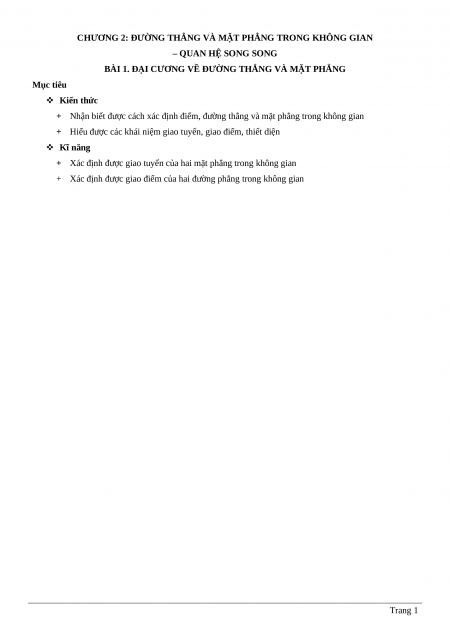 BÀI 1. ĐẠI CƯƠNG VỀ ĐƯỜNG THẲNG VÀ MẶT PHẲNG Mục tiêu Kiến thức