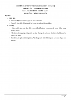 + Tính được góc giữa hai đường thẳng. Vận dụng được tích vô hướng của hai vectơ để giải các bài toán. Trang 1
