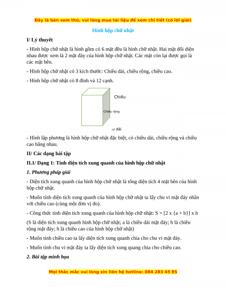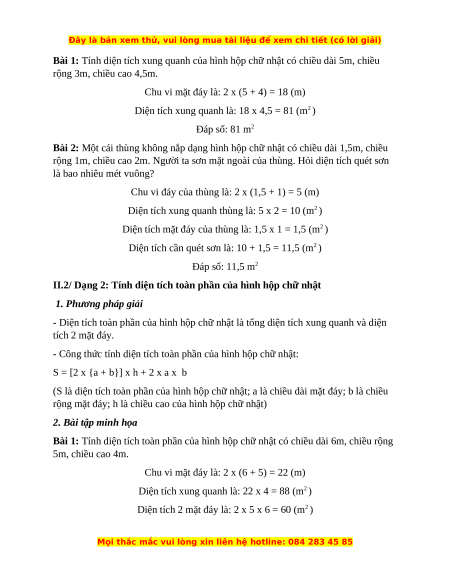 II.1/ Dạng 1: Tính diện tích xung quanh của hình hộp chữ nhật