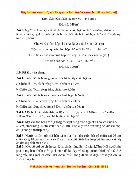 II.2/ Dạng 2: Tính diện tích toàn phần của hình hộp chữ nhật