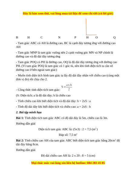 Bài 2: Tính chiều cao AH của tam giác ABC biết diện tích tam giác bằng 20cm2 độ dài đáy bằng 8cm. Hướng dẫn giải