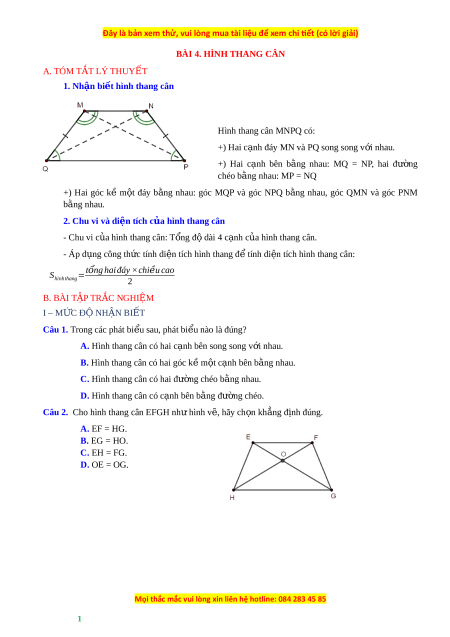 ằ nhau, góc QMN và góc PNM bằng nhau. 2. Chu vi và di n ệ tích c a ủ hình thang cân - Chu vi c a ủ hình thang cân: T ng ổ đ dà ộ i 4 c nh c ạ a ủ hình thang cân. - Áp d ng c ụ ông th c ứ tính di n t ệ ích hình thang đ t ể ính di n t ệ ích hình thang cân: t ng ổ haiđáy ×chiều cao Shìnhthang= 2 B. BÀI T P Ậ TR C N Ắ GHI M Ệ I – M C Đ Ứ N Ộ HẬN BI T Ế