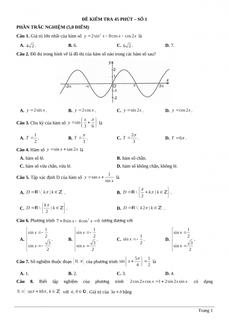 Câu 1. Giá trị lớn nhất của hàm số là A. . B. 6. C. . D. 7.