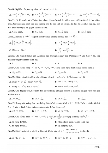 Câu 16. Cho đa giác đều 2018 đỉnh. Hỏi có bao nhiêu tam giác có đỉnh là đỉnh của đa giác và có một góc lớn hơn 100°? A. . B. . C. . D. .