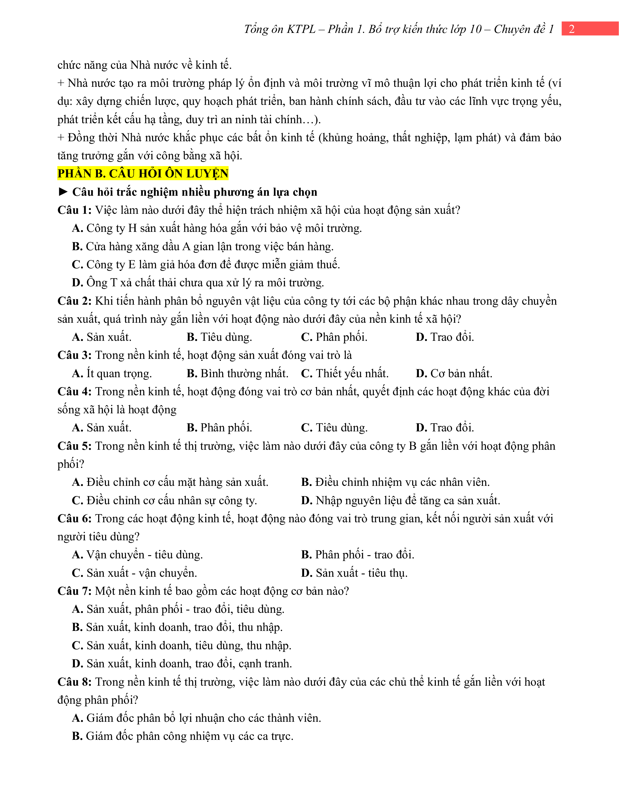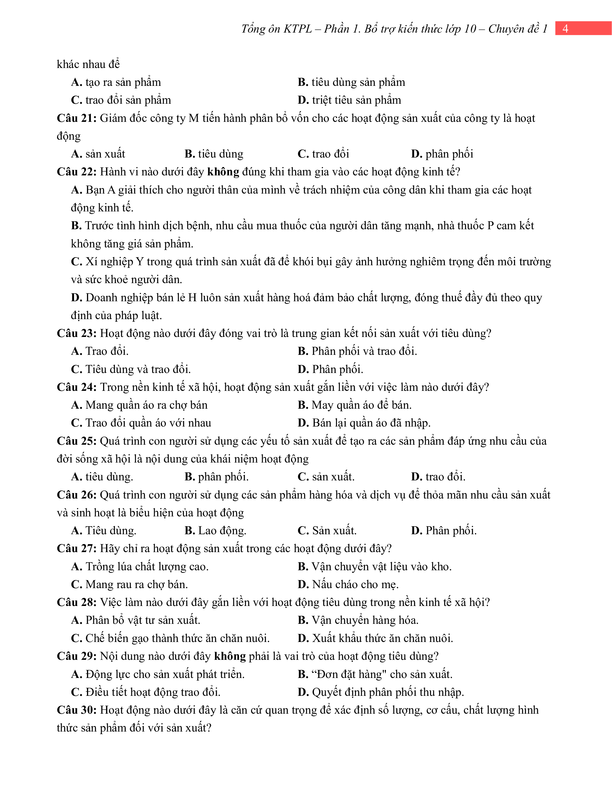 Câu 10. Điểm khởi đầu của mọi hoạt động kinh tế, tạo ra của cải vật chất, đáp ứng nhu cầu xã hội là hoạt động A. sản xuất. B. tiêu dùng. C. phân phối. D. trao đổi.