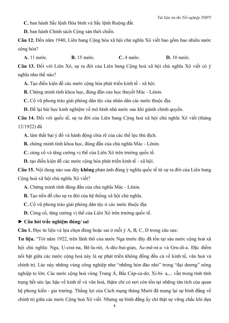 Câu 1. Khi mới thành lập, Liên Xô gồm 4 nước Cộng hoà Xô viết là