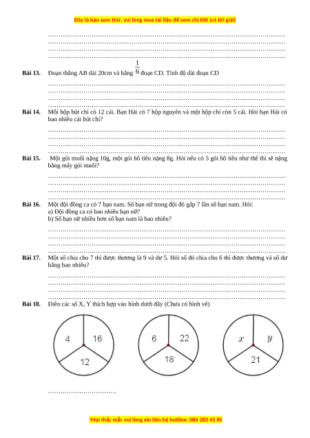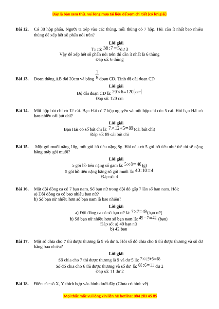 Bài 12. Có 38 hộp phấn. Người ta xếp vào các thùng, mỗi thùng có 7 hộp. Hỏi cần ít nhất bao nhiêu