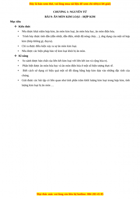 BÀI 9: ĂN MÒN KIM LOẠI – HỢP KIM Mục tiêu Kiến thức