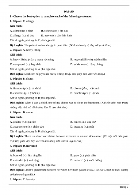 những việc nhà mà tôi thường làm là dọn nhà tắm.) 4. Đáp án: B. cancer Giải thích: