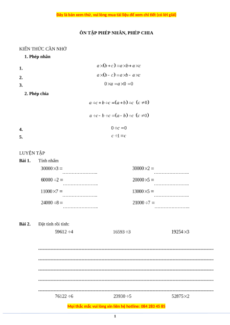 ÔN TẬP PHÉP NHÂN, PHÉP CHIA KIẾN THỨC CẦN NHỚ 1. Phép nhân 1. 2. 3. 2. Phép chia 4. 5. LUYỆN TẬP Bài 1. Tính nhẩm ………………….. ………………….. ………………….. ………………….. ………………….. ………………….. ………………….. ………………….. Bài 2. Đặt tính rồi tính: