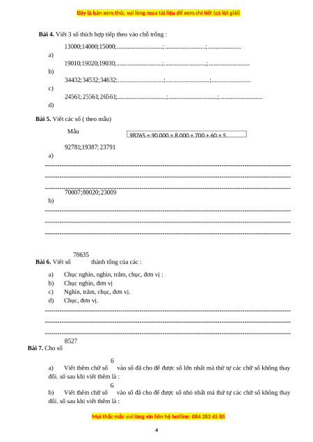 98765 = 90 000 + 8 000 + 700 + 60 + 5 a) b) Bài 6. Viết số thành tổng của các : a)