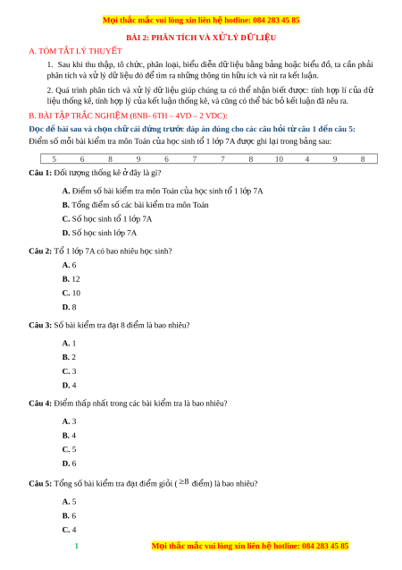 ớ đáp án đúng cho các câu h i ỏ từ câu 1 đ n ế câu 5: Đi m ể số m i ỗ bài ki m ể tra môn Toán c a ủ h c ọ sinh t 1 l ổ p 7A ớ đư c ợ ghi l i ạ trong b ng s ả au: 5 6 8 9 6 7 7 8 10 4 9 8 Câu 1: Đ i ố tư ng t ợ h ng ố kê đâ ở y là gì? A. Đi m ể s bà ố i kiểm tra môn Toán c a ủ h c ọ sinh t 1 l ổ p ớ 7A B. T ng ổ đi m ể s c ố ác bài ki m ể tra môn Toán C. S h ố c ọ sinh t 1 l ổ p ớ 7A D. S h ố c ọ sinh l p 7A ớ Câu 2: Tổ 1 l p 7A ớ có bao nhiêu h c ọ sinh? A. 6 B. 12 C. 10 D. 8 Câu 3: S