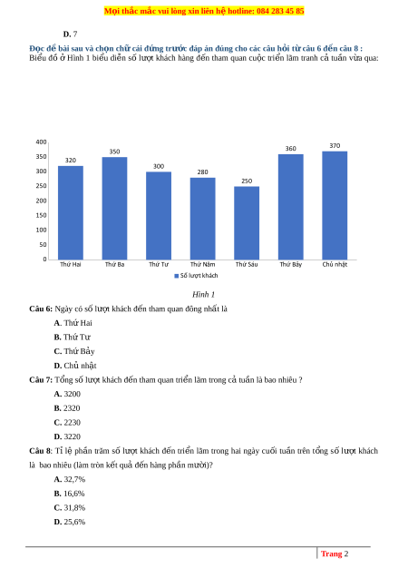 ố ượt khách đến tham quan đông nhất là A. Th H ứ ai B. Thứ Tư C. Th B ứ ảy D. Ch nh ủ ật Câu 7: T ng s ổ l ố ư t ợ khách đ n t ế ham quan tri n ể lãm trong c t ả u n l ầ à bao nhiêu ? A. 3200 B. 2320 C. 2230 D. 3220 Câu 8: Tỉ lệ ph n ầ trăm số lư t ợ khách đ n ế tri n ể lãm trong hai ngày cu i ố tu n ầ trên t ng ổ s ố lư t ợ khách là bao nhiêu (làm tròn k t ế quả đ n hà ế ng phần mư i ờ )? A. 32,7% B. 16,6% C. 31,8% D. 25,6% Trang 2 M i ọ thắc m c