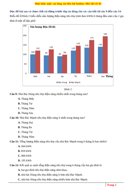 ng ít nhất trong tháng nào? A. Tháng Hai B. Tháng Ba C. Tháng Tư D. Tháng Năm Câu 11: T ng ổ lư ng ợ đi n nă ệ ng tiêu thụ c a ủ nhà Bác M nh t ạ rong 6 tháng là bao nhiêu? A. 664 kWh B. 859 kWh C. 800 kWh D. 195 kWh
