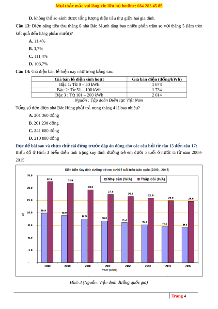 kết quả đến hàng phần mư i ờ )? A. 11,4% B. 3,7% C. 111,4% D. 103,7% Câu 14: Giá đi n bá ệ n l hi ẻ n na ệ y nh t ư rong bảng sau: Giá bán lẻ đi n ệ sinh ho t ạ Giá bán đi n ệ (đ n ồ g/kWh) Bậc 1: Từ 0 – 50 kWh 1 678 Bậc 2: Từ 51 – 100 kWh 1 734 Bậc 3 : T 101 – 200 kW ừ h 2 014 Ngu n