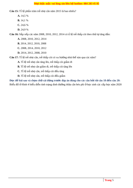 ớ đáp án đúng cho các câu h i ỏ t ừ câu 15 đ n ế câu 17: Biểu đồ ở Hình 3 bi u ể di n ễ tình tr ng ạ suy dinh dư ng ỡ trẻ em dư i ớ 5 tu i ổ ở nư c ớ ta từ năm 2008- 2015 Hình 3 (Ngu n: V ồ i n ệ dinh dư ng ỡ qu c ố gia) Trang 4