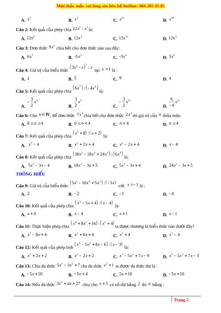 ệ otline: 084 283 45 85 A. 5 x B. 2 x C. 15 x D. 50 x Câu 2: Kết quả c a ủ phép chia 6 2 12x : x là: A. 8 12x B. 4 12x C. 12 12x D. 3 12x Câu 3: Đ n t ơ h c ứ 3