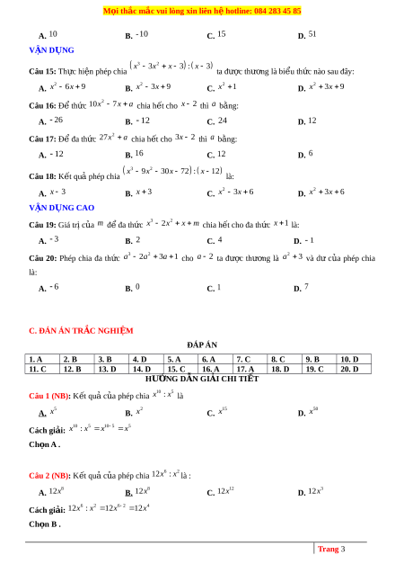 a 3 và dư của phép chia là: A. 6 B. 0 C. 1 D. 7 C. ĐÁN ÁN TR C Ắ NGHI M Ệ ĐÁP ÁN 1. A 2. B 3. B 4. D 5. A 6. A 7. C 8. C 9. B 10. D 11. C 12. B 13. D 14. D 15. C 16. A 17. A 18. D 19. C 20. D HƯ N Ớ G D N Ẫ GI I Ả CHI TI T Ế